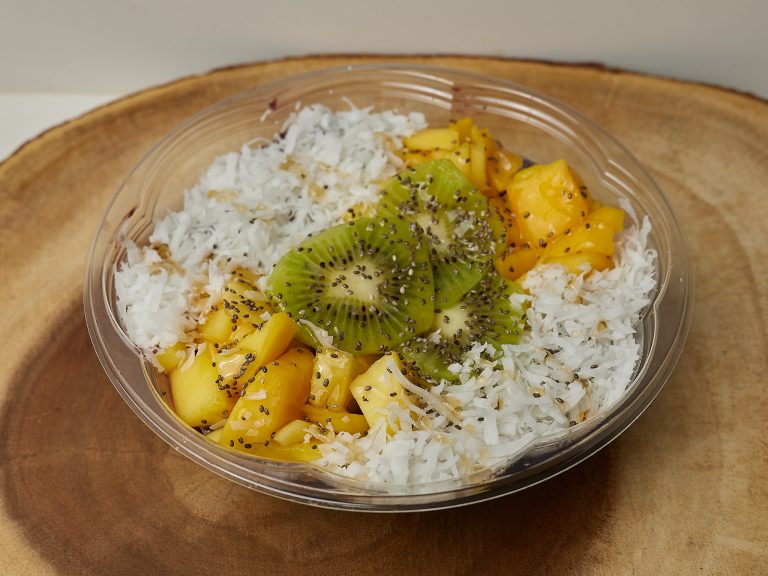 Mango, kiwi, Chia seeds, Coconut flakes and honey.
